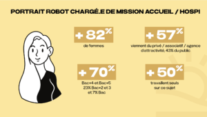 Qui sont les chargés de mission hospitalité ? 82% de femmes, 70% de diplômés à bac+4 ou bac+5, 57% issus du privé ou de l’associatif.