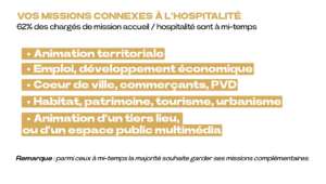 62% des chargés de mission accueil et hospitalité exercent parfois à temps plein à l’échelon départemental, et plutôt à mi-temps à l’échelle intercommunale, souvent en cumulant animation territoriale, développement économique ou programme Petites Villes de Demain. Une polyvalence qu’ils revendiquent : plus ils connaissent leur territoire, mieux ils accompagnent les familles.